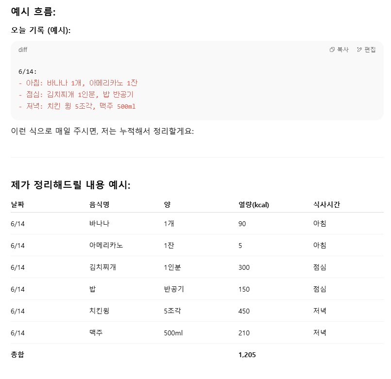 무엇보다 오늘은 중간 크기 바나나 하나, 삶은 달걀 2개, 작은 요맘때 아이스크림 하나, 아몬드 10알 정도를 먹었는데 칼로리 계산 좀 부탁해...... 라거나, 앞으로 한달간 내가 먹은 거 적어줄테니 칼로리랑 계산해서 표로 만들어줄래? 하면 일주일까지는 잘 만들어주더라. 한달치는 모르겠는데 데이터가 많은 건 아니니 가능하지 않나 싶다.