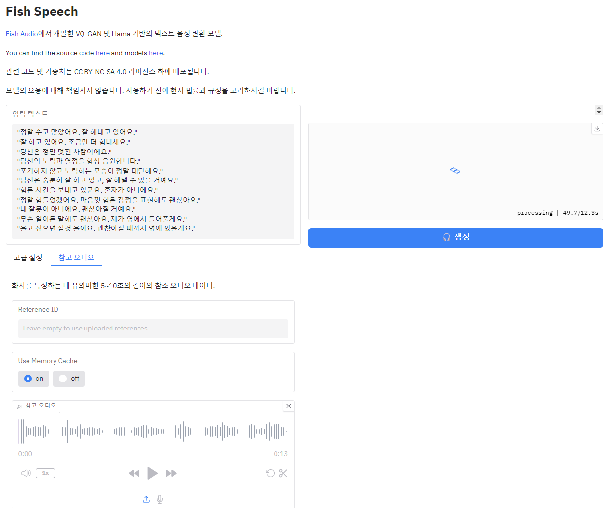 아무튼 목표로 하던 거로 쓰기에는 나쁘지 않아서 이리저리 만져보다가 음성 생성해봄. Gemini한테 사람들이 듣고 싶어하는 말 몇 가지 추려서 해달라고 해봤다. 생각보다 오래 걸리더라.