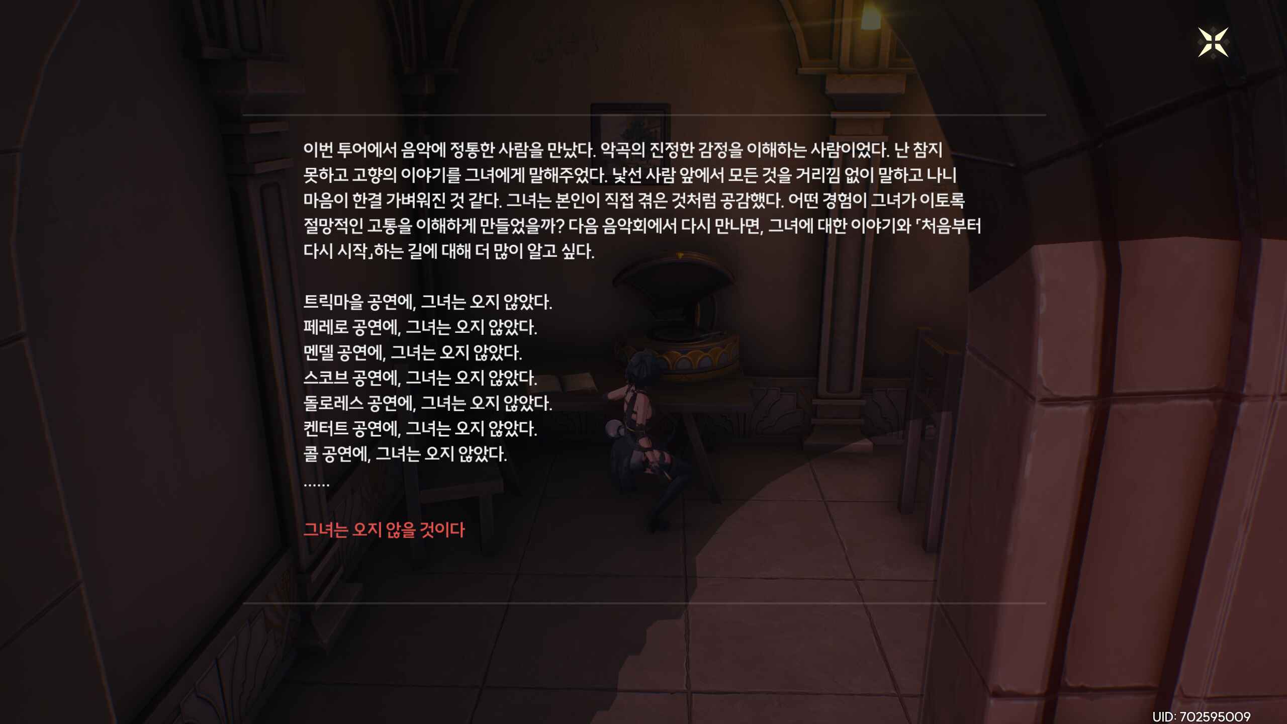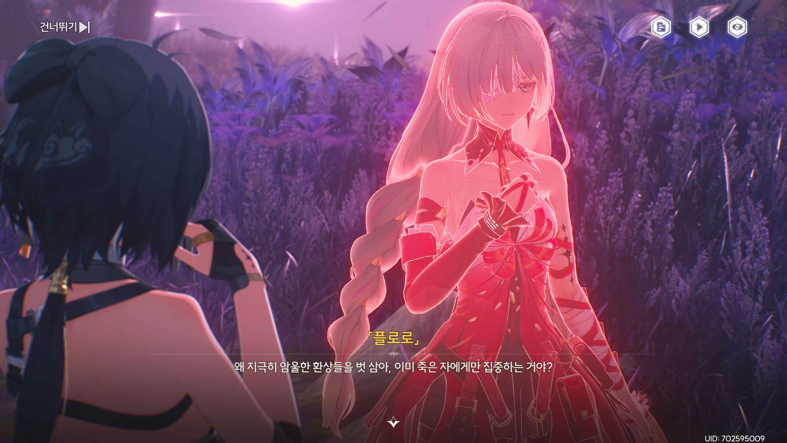 이번 스토리에서 꽤 많은 내용이 나와서... 서로 서로 결국은 인간을 사랑하면서도, 서로를 비인간적이라 비방하는 장면, 장면의 전환, 피안화, 3D 모델링, 표정 표현, 적당한 조작, 음악, 성우분(마영전 벨 성우분이셨다!)의 열연, 다 무난하게 좋았다. 방랑자는 남캐로 하는게 정말 인기가 많을 것 같다. 스토리 다시보기좀 만들어주세요...쿠로....