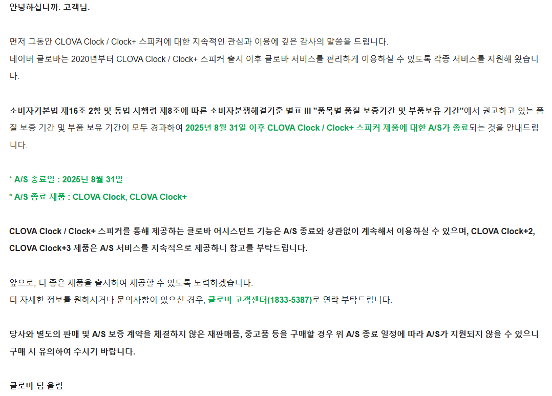CLOVA Clock 및 CLOVA Clock+ A/S 종료 안내 2025.08.14 21:37 PC.Div.Soft 반응형 네이버 클로바 스피커 제품군 중 CLOVA Clock/Clock+의 A/S가 25년 8월 31일 후로 종료된다고 합니다. 클락 +2, 클락 +3의 경우 아직 A/S를 지원한다고 하고요. 앞으로 클로바AI를 사용한 스피커는 더 출시 안하는지 이건 좀 걱정되긴 하네요. 역시 믿을 건 구글 뿐인가...음....구글도 이쪽은 손 땐 것 같은데.... 반응형 공유하기 게시글 관리 Klein Berry 'PC.Div.Soft' 카테고리의 다른 글 알리)마우스 번지 (0) 2025.08.17 DOSBOX-X에 Win98SE설치 (0) 2025.08.06 MediaTek MT7925 (0) 2025.08.01 댓글 공유하기 다른 글 댓글 이 글 공유하기 구독하기 구독하기 카카오톡 카카오톡 라인 라인 트위터 트위터 Facebook Facebook 카카오스토리 카카오스토리 밴드 밴드 네이버 블로그 네이버 블로그 Pocket Pocket Evernote Evernote 다른 글 컴퓨존 멀티탭 할인 이벤트 컴퓨존 멀티탭 할인 이벤트 2025.08.21 알리)마우스 번지 알리)마우스 번지 2025.08.17 DOSBOX-X에 Win98SE설치 DOSBOX-X에 Win98SE설치 2025.08.06 MediaTek MT7925 MediaTek MT7925 2025.08.01 다른 글 더 둘러보기