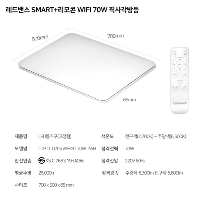 개인적으로 55W는 조금 어두운 느낌 들고, 70W면 밤에 켜두기가 좀 부담되는 수준이긴 하더라만은, 다만 보통은 리모컨으로 밝기 조절되니까 큰 문제 없이 그냥 밝은 거 삽시다. 앱 지원, 리모컨 지원한다고. 금액도 LED 여러개 교체하는 비용보다 조금 비싼 정도라서 크게 부담 안되게 설치 가능하다. 거실 천장에 보강이 어떻느냐에 따라 다르긴 하지만. 일단 스마트폰으로 제어가 가능하단것도 장점이고 누워서 리모컨으로 불을 켜고 끌 수 있는 것도 장점.