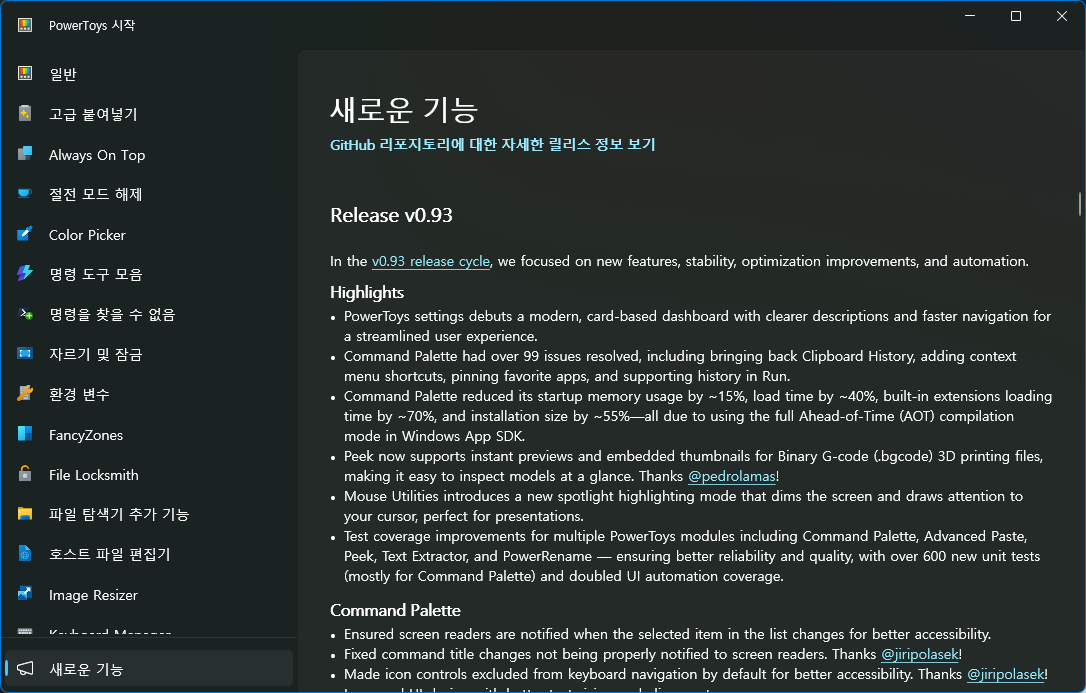 PowerToys 0.93 업데이트, UI개선 등 2025.08.15 23:30 PC.Div.Soft/Free Software 반응형 윈도용 유틸리티 PowerToys 0.93버전에서 UI 개선이 이루어졌다고 합니다. 명령 팔레트, 대시보드 등에서의 개선이 주가 되고, 커서 찾기에서의 옵션 추가, PowerRename 등의 조금씩 개선되었다고 하니 사용하는 분들은 업데이트를 챙겨보세요. 반응형 공유하기 게시글 관리 Klein Berry 'PC.Div.Soft > Free Software' 카테고리의 다른 글 FlexASIO - 범용 ASIO 드라이버 (0) 2025.09.06 7-zip 25.01 업데이트 (0) 2025.08.05 Blender 4.5.1 업데이트 (0) 2025.07.31 댓글 공유하기 다른 글 댓글 이 글 공유하기 구독하기 구독하기 카카오톡 카카오톡 라인 라인 트위터 트위터 Facebook Facebook 카카오스토리 카카오스토리 밴드 밴드 네이버 블로그 네이버 블로그 Pocket Pocket Evernote Evernote 다른 글 SG(SpeedGuide) TCP 옵티마이저 SG(SpeedGuide) TCP 옵티마이저 2025.10.09 FlexASIO - 범용 ASIO 드라이버 FlexASIO - 범용 ASIO 드라이버 2025.09.06 7-zip 25.01 업데이트 7-zip 25.01 업데이트 2025.08.05 Blender 4.5.1 업데이트 Blender 4.5.1 업데이트 2025.07.31 다른 글 더 둘러보기