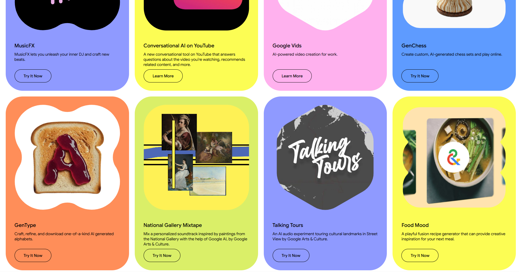 구글 요금제 구독시 주어지는 AI 크레딧을 좀 더 알차게 써먹을 수 있다. 제미나이도 쓰고 구글 드라이브도 쓰고 AI도 쓰고. 챗봇에서 제한있는 것 외에도. 기본적으로 잘 알려진 Flow, Whisk외에 여러 한번쯤 클릭해볼만한 것들 있다. 체스 만들기, 퓨전 요리 레시피 만들기 같은 것도 재밌음.