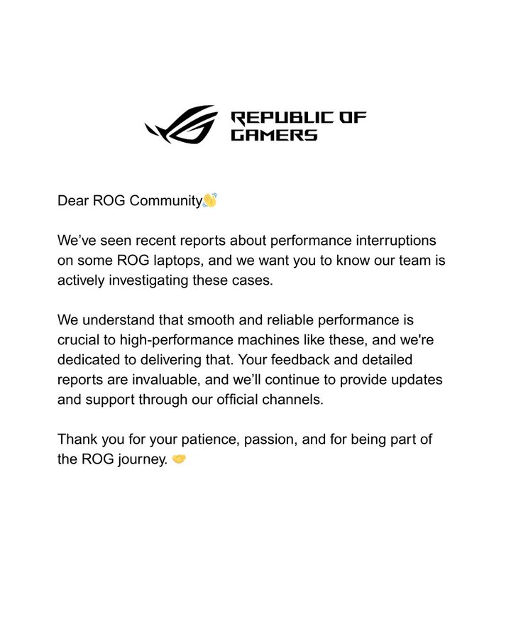 ASUS, 끊김 문제와 관련하여 해결을 약속 2025.09.18 21:55 PC.Div.Soft/News 반응형 ASUS ROG 노트북 사용자들이(특히 2021~2024 출시 제품군)이 겪는 버벅임 문제와 관련하여 ASUS ROG North America X 계정을 통해 이와 관련하여 성명을 냈습니다. 일부 ROG 노트북에서의 성능 저하 현상 보고와 관련하여 문제를 조사하고 있고, 업데이트와 지원을 할 것을 약속한다고 하네요. 반응형 공유하기 게시글 관리 Klein Berry 'PC.Div.Soft > News' 카테고리의 다른 글 구름 IDE 서비스 종료 (0) 2025.09.23 LATTEPANDA, IOTA 출시 (0) 2025.09.18 AOMedia, 연말에 AV2 코덱 출시 예정 (0) 2025.09.16 댓글 공유하기 다른 글 댓글 이 글 공유하기 구독하기 구독하기 카카오톡 카카오톡 라인 라인 트위터 트위터 Facebook Facebook 카카오스토리 카카오스토리 밴드 밴드 네이버 블로그 네이버 블로그 Pocket Pocket Evernote Evernote 다른 글 MSI, AM4 플램폼 BIOS 업데이트 시작 MSI, AM4 플램폼 BIOS 업데이트 시작 2025.09.26 구름 IDE 서비스 종료 구름 IDE 서비스 종료 2025.09.23 LATTEPANDA, IOTA 출시 LATTEPANDA, IOTA 출시 2025.09.18 AOMedia, 연말에 AV2 코덱 출시 예정 AOMedia, 연말에 AV2 코덱 출시 예정 2025.09.16 다른 글 더 둘러보기