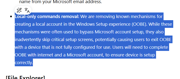 윈도11 IP, 더 이상 로컬 계정 생성 불가 2025.10.09 04:40 PC.Div.Soft/Windows.Office 반응형 Windows 11 IP 빌드 26120.6772에서 다크 모드 개선과 더불어 로컬 계정 생성 불가와 관련한 내용이 포함되었습니다. 윈도가 점점 스마트폰용 OS와 닮아가는 것 같습니다. 아니 데스크톱 환경을 이렇게 몰라서야....이제 믿을 건 RUFUS 뿐이네요... 반응형 공유하기 게시글 관리 Klein Berry 'PC.Div.Soft > Windows.Office' 카테고리의 다른 글 Windows 11 미디어 제작 도구가 올바르게 구동되지 않는 문제 (0) 2025.10.16 Windows 11 25H2 정식 출시 (0) 2025.10.02 Windows 11 IP(26x20.6690)에서 비디오 배경 지정 가능 (0) 2025.09.23 댓글 공유하기 다른 글 댓글 이 글 공유하기 구독하기 구독하기 카카오톡 카카오톡 라인 라인 트위터 트위터 Facebook Facebook 카카오스토리 카카오스토리 밴드 밴드 네이버 블로그 네이버 블로그 Pocket Pocket Evernote Evernote 다른 글 Windows 11, 복구화면에서 USB 키보드, 마우스가 동작하지 않는 문제 수정 Windows 11, 복구화면에서 USB 키보드, 마우스가 동작하지 않는 문제 수정 2025.10.21 Windows 11 미디어 제작 도구가 올바르게 구동되지 않는 문제 Windows 11 미디어 제작 도구가 올바르게 구동되지 않는 문제 2025.10.16 Windows 11 25H2 정식 출시 Windows 11 25H2 정식 출시 2025.10.02 Windows 11 IP(26x20.6690)에서 비디오 배경 지정 가능 Windows 11 IP(26x20.6690)에서 비디오 배경 지정 가능 2025.09.23 다른 글 더 둘러보기