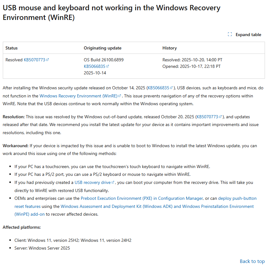 Windows 11, 복구화면에서 USB 키보드, 마우스가 동작하지 않는 문제 수정 2025.10.21 18:47 PC.Div.Soft/Windows.Office 반응형 MS가 Windows 11 24H2, 25H2에서 발생한 문제인 Windows 복구 환경(WinRE)에서 USB 마우스와 키보드를 사용할 수 없는 버그가 있었다고 합니다. 이 버그는 KB5070773으로 해결된다고 하네요. 세상에 대체 어떻게 테스트하기에 이런 문제가.....와..관리자님들 머리 꽤 아프셨겠는데요... 반응형 공유하기 게시글 관리 Klein Berry 'PC.Div.Soft > Windows.Office' 카테고리의 다른 글 MS, 파일 탐색기가 인터넷에서 다운로드한 파일은 미리 보기 기능 제외 (0) 2025.10.25 Windows 11 미디어 제작 도구가 올바르게 구동되지 않는 문제 (0) 2025.10.16 윈도11 IP, 더 이상 로컬 계정 생성 불가 (0) 2025.10.09 댓글 공유하기 다른 글 댓글 이 글 공유하기 구독하기 구독하기 카카오톡 카카오톡 라인 라인 트위터 트위터 Facebook Facebook 카카오스토리 카카오스토리 밴드 밴드 네이버 블로그 네이버 블로그 Pocket Pocket Evernote Evernote 다른 글 윈도11 누락된 폰트 설치하기 윈도11 누락된 폰트 설치하기 2025.10.26 MS, 파일 탐색기가 인터넷에서 다운로드한 파일은 미리 보기 기능 제외 MS, 파일 탐색기가 인터넷에서 다운로드한 파일은 미리 보기 기능 제외 2025.10.25 Windows 11 미디어 제작 도구가 올바르게 구동되지 않는 문제 Windows 11 미디어 제작 도구가 올바르게 구동되지 않는 문제 2025.10.16 윈도11 IP, 더 이상 로컬 계정 생성 불가 윈도11 IP, 더 이상 로컬 계정 생성 불가 2025.10.09 다른 글 더 둘러보기