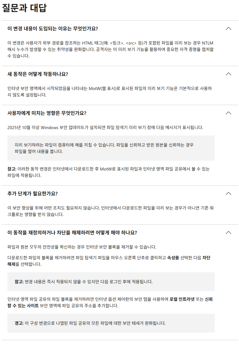MS, 파일 탐색기가 인터넷에서 다운로드한 파일은 미리 보기 기능 제외 2025.10.25 15:57 PC.Div.Soft/Windows.Office 반응형 MS에서 25년 10월 14일 이후 출시된 Windows 보안 업데이트부터 파일 탐색기가 인터넷에서 다운로드한 파일에 대해 미리 보기 기능을 자동으로 사용하지 않도록 설정한다고 합니다. 잠재적인 보안 위협으로부터 사용자를 지키기 위해서라고 하네요. 반응형 공유하기 게시글 관리 Klein Berry 'PC.Div.Soft > Windows.Office' 카테고리의 다른 글 윈도11 누락된 폰트 설치하기 (0) 2025.10.26 Windows 11, 복구화면에서 USB 키보드, 마우스가 동작하지 않는 문제 수정 (0) 2025.10.21 Windows 11 미디어 제작 도구가 올바르게 구동되지 않는 문제 (0) 2025.10.16 댓글 공유하기 다른 글 댓글 이 글 공유하기 구독하기 구독하기 카카오톡 카카오톡 라인 라인 트위터 트위터 Facebook Facebook 카카오스토리 카카오스토리 밴드 밴드 네이버 블로그 네이버 블로그 Pocket Pocket Evernote Evernote 다른 글 윈도11 업데이트 후 입력 소리가 이상할 때 윈도11 업데이트 후 입력 소리가 이상할 때 2025.10.26 윈도11 누락된 폰트 설치하기 윈도11 누락된 폰트 설치하기 2025.10.26 Windows 11, 복구화면에서 USB 키보드, 마우스가 동작하지 않는 문제 수정 Windows 11, 복구화면에서 USB 키보드, 마우스가 동작하지 않는 문제 수정 2025.10.21 Windows 11 미디어 제작 도구가 올바르게 구동되지 않는 문제 Windows 11 미디어 제작 도구가 올바르게 구동되지 않는 문제 2025.10.16 다른 글 더 둘러보기
