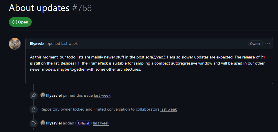 At this moment, our todo lists are mainly newer stuff in the post sora2/veo3.1 era so slower updates are expected. The release of P1 is still on the list. Besides P1, the FramePack is suitable for sampling a compact autoregressive window and will be used in our other newer models, maybe together with some other architectures.