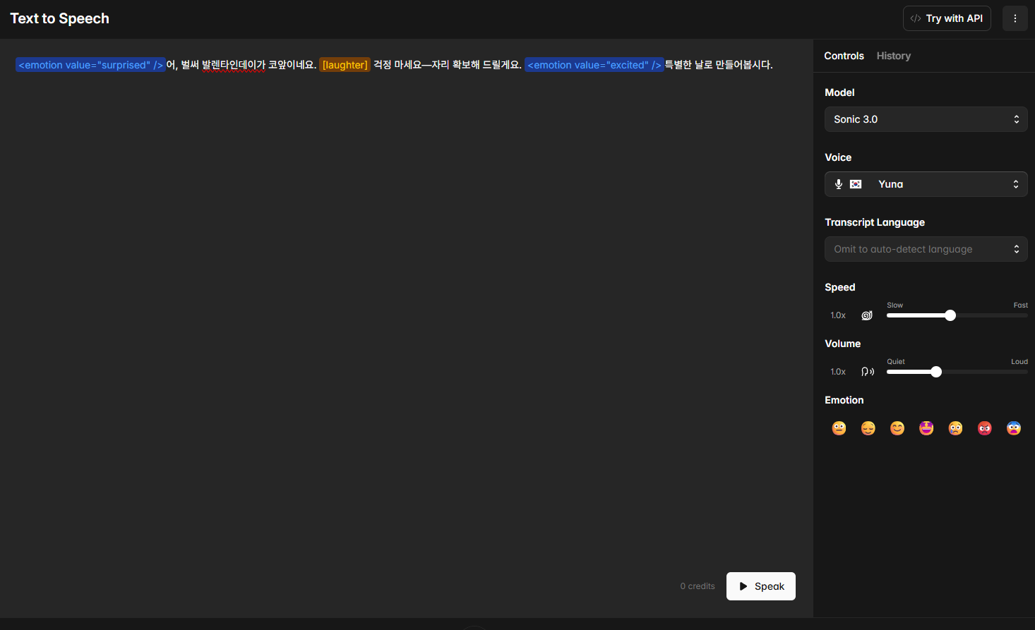 어....근데 웹에서는 영어는 잘 되는데 일본어랑 한국어는 선택해도 올바르게 안되네요; 스튜디오에서는 잘 되고요. 우후훗, 응하하하... 같은 느낌으로 웃는게 큰 차이는 없고 다 비슷하긴 하지만요. 이모션을 넣어주고 말고는 전체적인 톤의 변화가 중심인 것 같고요. 어, 벌써... 어우, 벌써, 어와, 벌써....