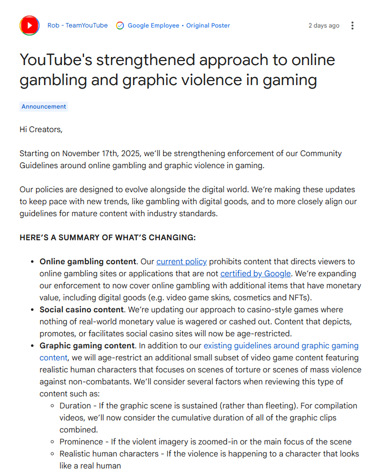 Youtube가 11월 17일부터 온라인 도박 및 게임 내 표현과 관련한 커뮤니티 가이드라인을 강화할 것이라고 발표했습니다. 구글이 인증한 온라인 도박 사이트 이외로 시청자를 안내하는 서비스의 강화로 도박 및 게임 스킨, 화장품, NFT 등의 금전적인 범위를 포함할 것이라고 하며, 소셜(현실에 금전적인 가치를 주지 않는 범위의) 카지노의 묘사 및 홍보에도 연령 제한이 적용된다고 합니다.
