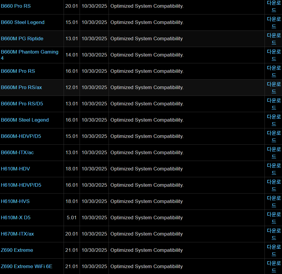 ASRock, Intel 600/700 시리즈 머더보드 BIOS 업데이트 2025.11.06 15:00 PC.Div.Soft/Driver.Firmware 반응형 ASRock에서 자사의 인텔 600 칩셋을 사용한 머더보드의 BIOS 업데이트가 진행되고 있습니다. 시스템 호환성 향상이 주된 내용이고요, 700시리즈부터 진행되었는데, 600 계열도 거의 완료되었네요. 이뿐만 아니라 베타 바이오스 정보를 확인하면 500시리즈의 ME/마이크로코드 업데이트, AMD 300시리즈의 AGESA 1.2.0.F 업데이트 등이 이루어지고 있으니 사용하시는 분들은 업데이트를 챙겨보세요. 반응형 공유하기 게시글 관리 Klein Berry 'PC.Div.Soft > Driver.Firmware' 카테고리의 다른 글 NVIDIA, Geforce 핫픽스 드라이버 공개(581.94) (0) 2025.11.22 PC 모니터용 앰비라이트 스트립 제어 소프트웨어 (0) 2025.10.29 GIGABYTE B760M AORUS ELITE DDR4 BIOS 업데이트 (0) 2025.10.14 댓글 공유하기 다른 글 댓글 이 글 공유하기 구독하기 구독하기 카카오톡 카카오톡 라인 라인 트위터 트위터 Facebook Facebook 카카오스토리 카카오스토리 밴드 밴드 네이버 블로그 네이버 블로그 Pocket Pocket Evernote Evernote 다른 글 ASUS TUF GAMING B660M-PLUS D4 BIOS 업데이트 ASUS TUF GAMING B660M-PLUS D4 BIOS 업데이트 2025.11.26 NVIDIA, Geforce 핫픽스 드라이버 공개(581.94) NVIDIA, Geforce 핫픽스 드라이버 공개(581.94) 2025.11.22 PC 모니터용 앰비라이트 스트립 제어 소프트웨어 PC 모니터용 앰비라이트 스트립 제어 소프트웨어 2025.10.29 GIGABYTE B760M AORUS ELITE DDR4 BIOS 업데이트 GIGABYTE B760M AORUS ELITE DDR4 BIOS 업데이트 2025.10.14 다른 글 더 둘러보기