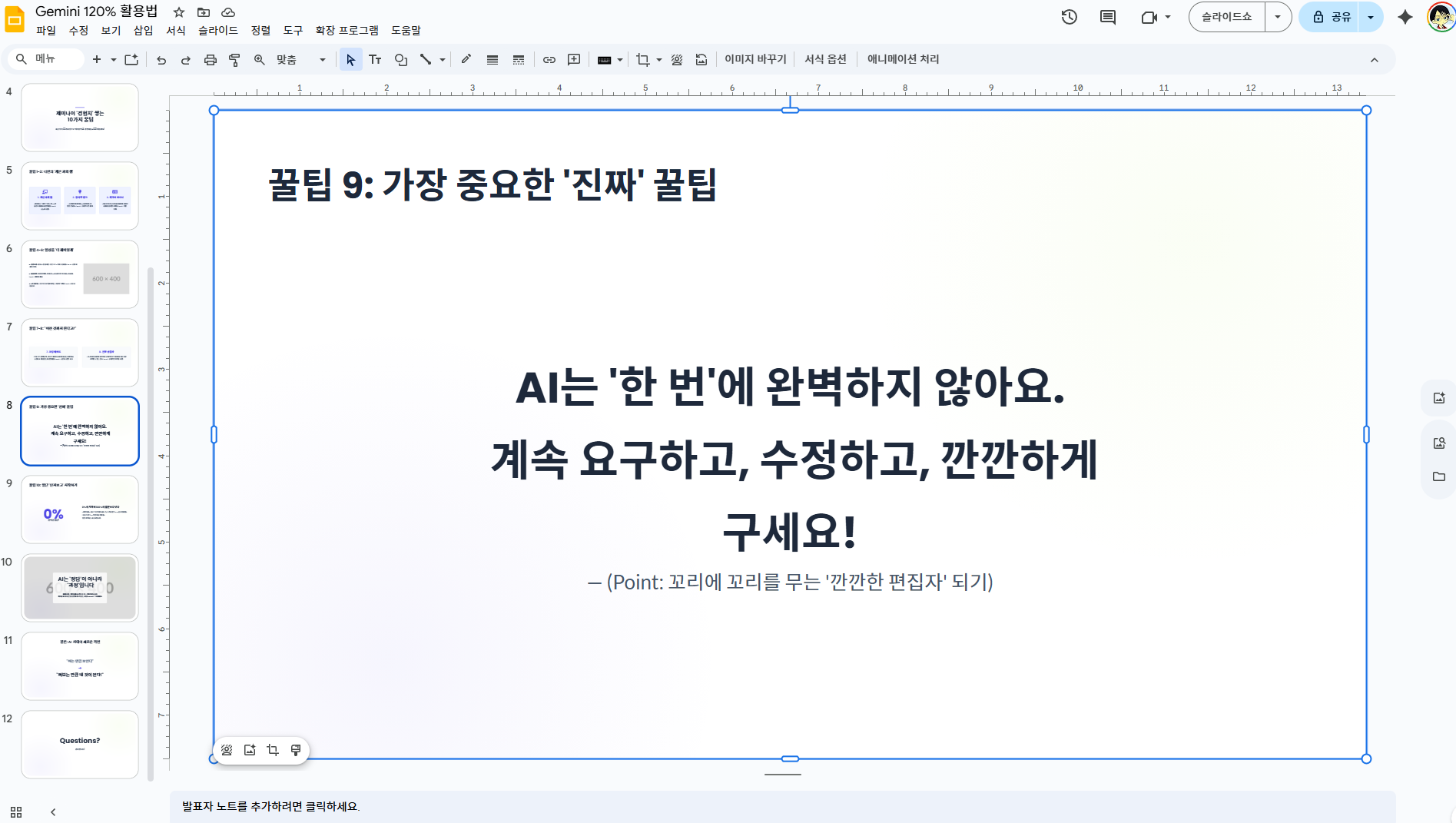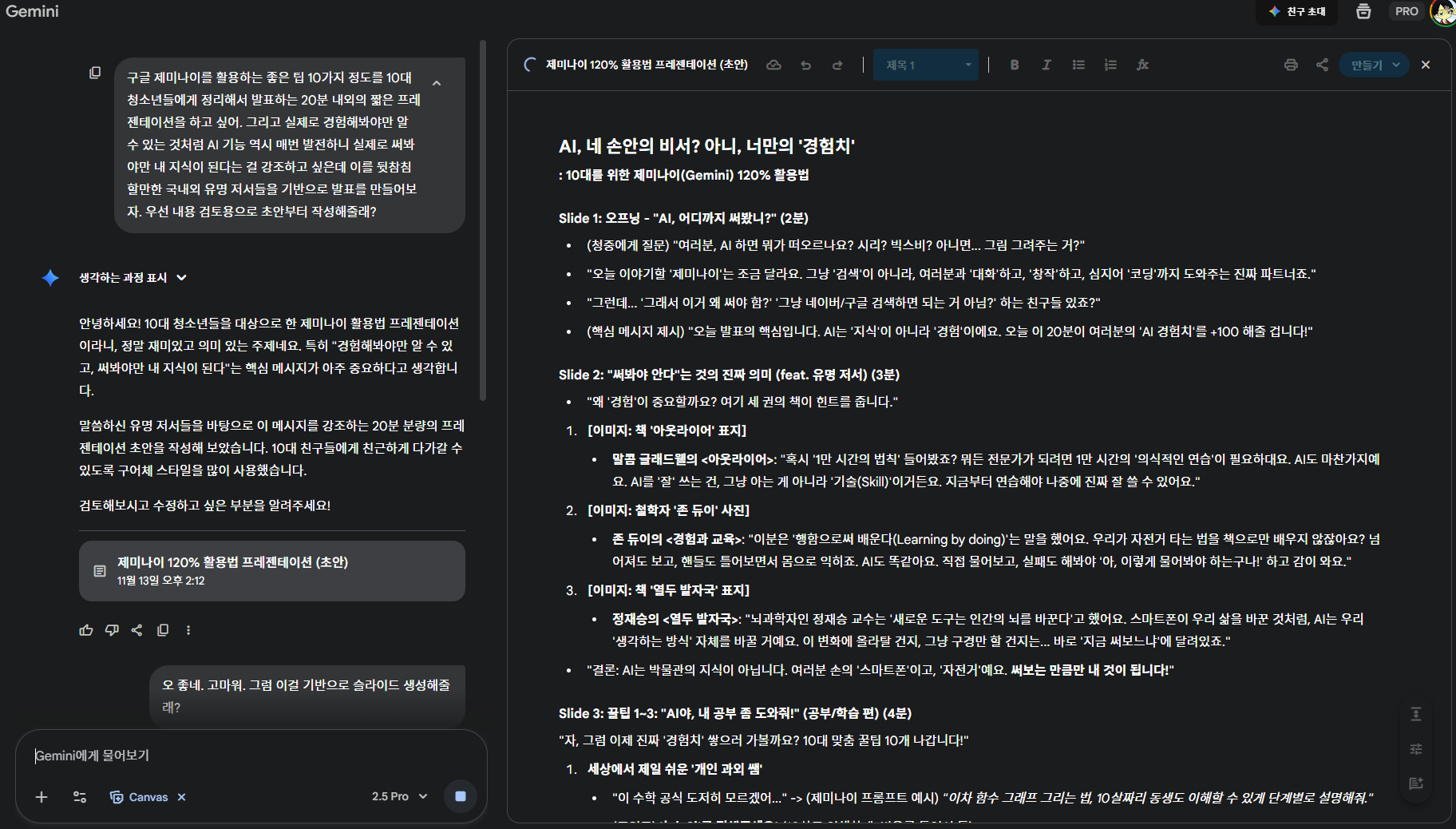 Gemini에서 캔버스를 기반으로 슬라이드를 제작해 주는 기능에 자사 워크스페이스의 Slides로 내보내는 기능이 추가되었습니다. 이제 슬라이드의 내용 편집이 더 편해졌네요. 어피니티가 무료화되서 찍먹해보고 있는 캔바보다 Gemini가 전체적인 맥락 잡기, 내용 분배, 필요한 인포그래픽 생성 및 내용 확정은 더 나은 것 같습니다.