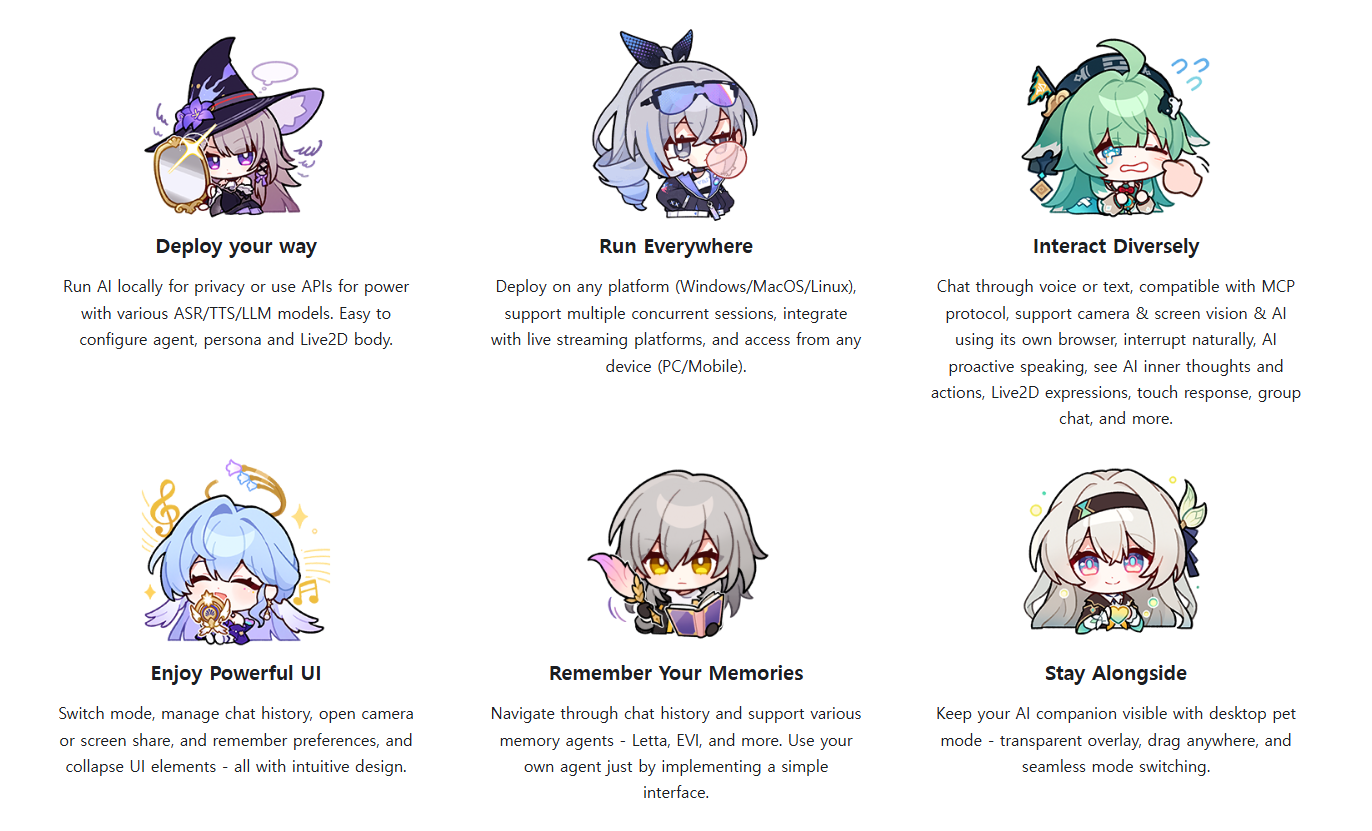 실시간 목소리와 라이브 2D로 반응하는 당신의 AI 와이프! 공식 페이지의 아이콘은 붕스다. 다만 이것저것 다 로컬로 구동하려면 PC 사양이 상당히 좋아야 하지 않을까...싶긴 함. 깃헙에 exe랑 zip 다 제공되길래 exe만 받았더니 안되고, zip 파일 받아서 설정해줘야 하더라. 문서는 여기서 확인 가능. 목소리도 인식하더라. 와....이게 AIRI보다 나은 듯.