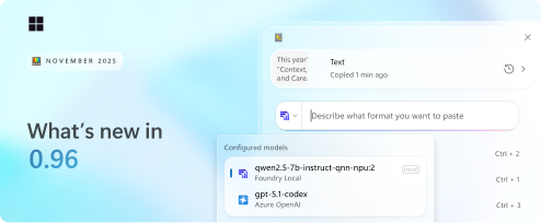 Powertoys 0.96 버전 출시 2025.11.19 21:22 PC.Div.Soft 반응형 파워토이의 0.96버전이 출시되었습니다. 고급 붙여 넣기 개선(다수 AI 에이전트 지원), 명령 팔레트 개선, Awake 버그 수정 등이 이루어졌네요. 사용하는 분들은 업데이트를 챙겨보시길. 반응형 공유하기 게시글 관리 Klein Berry 'PC.Div.Soft' 카테고리의 다른 글 Blender 5.0 출시 (0) 2025.11.20 USB 컨트롤러 리소스 부족 메시지 표시시 (0) 2025.11.19 NVIDIA TESLA K80 (0) 2025.11.09 댓글 공유하기 다른 글 댓글 이 글 공유하기 구독하기 구독하기 카카오톡 카카오톡 라인 라인 트위터 트위터 Facebook Facebook 카카오스토리 카카오스토리 밴드 밴드 네이버 블로그 네이버 블로그 Pocket Pocket Evernote Evernote 다른 글 TrayStatus - 트레이에 각종 정보 표시앱 TrayStatus - 트레이에 각종 정보 표시앱 2025.11.21 Blender 5.0 출시 Blender 5.0 출시 2025.11.20 USB 컨트롤러 리소스 부족 메시지 표시시 USB 컨트롤러 리소스 부족 메시지 표시시 2025.11.19 NVIDIA TESLA K80 NVIDIA TESLA K80 2025.11.09 다른 글 더 둘러보기