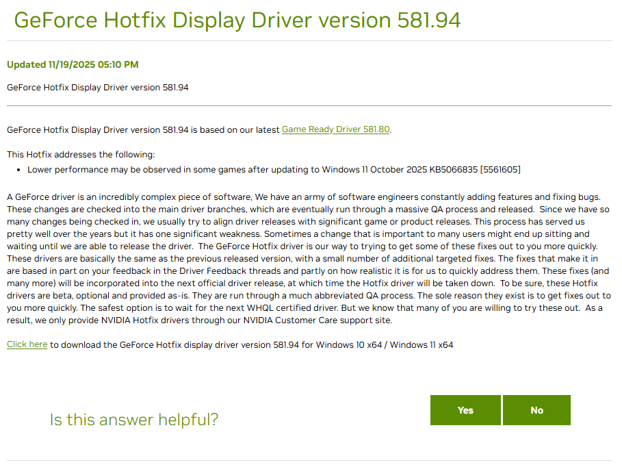 NVIDIA, Geforce 핫픽스 드라이버 공개(581.94) 2025.11.22 19:43 PC.Div.Soft/Driver.Firmware 반응형 NVIDIA가 윈도 11 KB5066835업데이트를 설치 후 일부 게임에서 성능이 저하되는 문제를 수정한 핫픽스 드라이버를 배포했습니다. 관련 문제 겪으시는 분들은 핫픽스 드라이버 설치를 고려해보세요. 반응형 공유하기 게시글 관리 Klein Berry 'PC.Div.Soft > Driver.Firmware' 카테고리의 다른 글 ASUS TUF GAMING B660M-PLUS D4 BIOS 업데이트 (0) 2025.11.26 ASRock, Intel 600/700 시리즈 머더보드 BIOS 업데이트 (0) 2025.11.06 PC 모니터용 앰비라이트 스트립 제어 소프트웨어 (0) 2025.10.29 댓글 공유하기 다른 글 댓글 이 글 공유하기 구독하기 구독하기 카카오톡 카카오톡 라인 라인 트위터 트위터 Facebook Facebook 카카오스토리 카카오스토리 밴드 밴드 네이버 블로그 네이버 블로그 Pocket Pocket Evernote Evernote 다른 글 ASUS B850M MAX GAMING WIFI BIOS 업데이트 ASUS B850M MAX GAMING WIFI BIOS 업데이트 2025.11.29 ASUS TUF GAMING B660M-PLUS D4 BIOS 업데이트 ASUS TUF GAMING B660M-PLUS D4 BIOS 업데이트 2025.11.26 ASRock, Intel 600/700 시리즈 머더보드 BIOS 업데이트 ASRock, Intel 600/700 시리즈 머더보드 BIOS 업데이트 2025.11.06 PC 모니터용 앰비라이트 스트립 제어 소프트웨어 PC 모니터용 앰비라이트 스트립 제어 소프트웨어 2025.10.29 다른 글 더 둘러보기