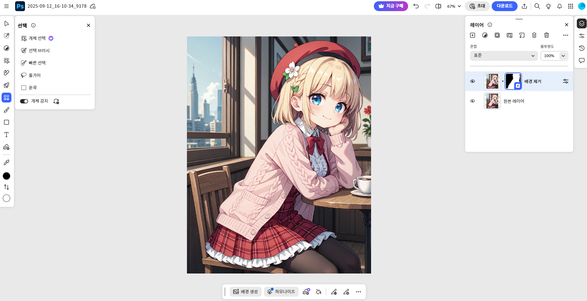 근데 이거 파일 열 때마다 구독하라는 메시지 띄우네요.....; 메시지 띄우는 거 말고는 대부분의 기능이 무료인 건 맞고요. 배경제거, 하프톤, 디더, 모자이크 같은 기능들은 여타 앱들에 적용하는 만큼 쉽게(클릭 클릭 클릭)으로 할 수 있고, 슬라이드로 효과를 제어할 수 있긴합니다. 근데 이런 앱들은 사실 스마트폰 앱으로 되게 잘....되는 기능들이라서 조금 미묘하긴 하네요. 파이어 플라이 기능 사용하려면 별도 크레딧 소모나 구독은 필요합니다. 하모나이즈 등의 기능도 써볼 수 있고요. 크레딧 소모가 좀 크긴 하지만 전체적인 명함 느낌이랑도 바꿔주네요.