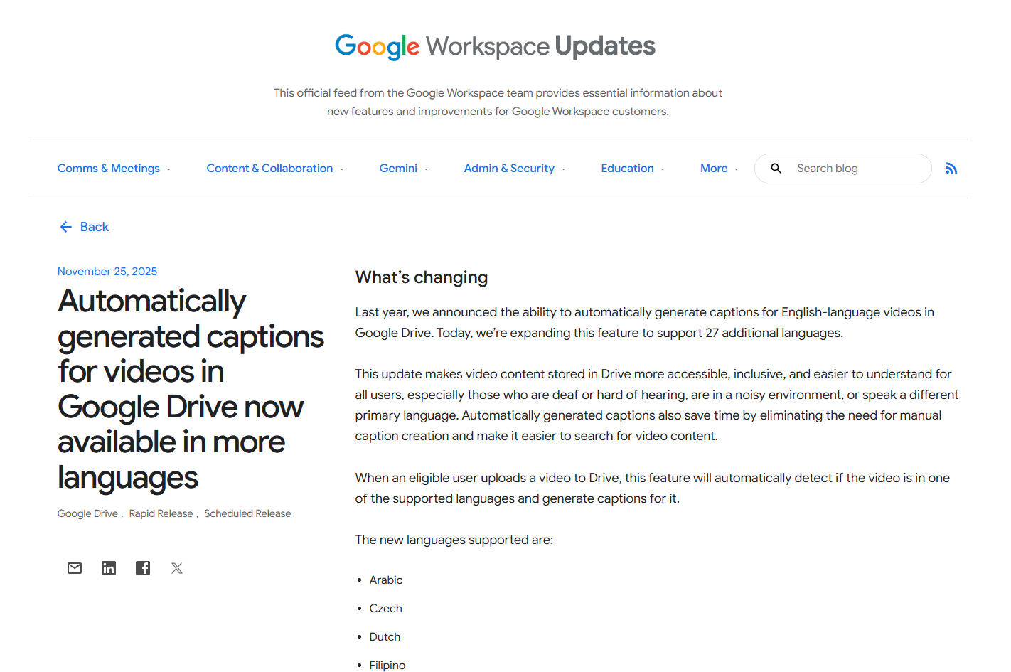 구글 드라이브(워크스페이스)에 저장된 동영상에 자동으로 영어 자막을 생성해주던 기능이 이제 한국어를 포함한 다국어 자막 생성을 지원한다고 합니다.
