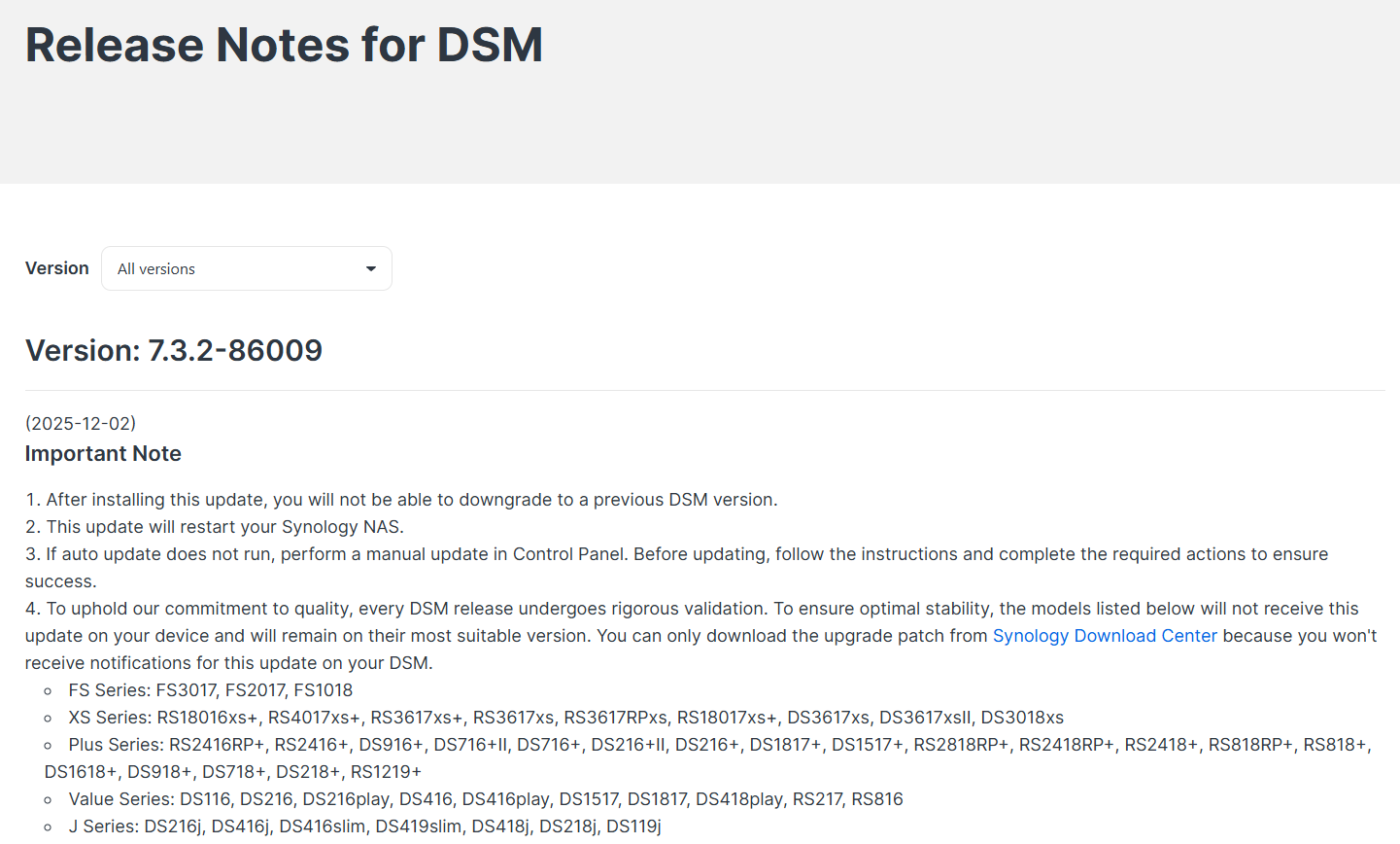 시놀리지 DSM 7.3.2-86009 출시 2025.12.02 22:26 ETC.Mobile/Nas.HomeLab 반응형 여러 보안 취약점과 버그를 수정한 시놀로지 DSM 7.3.2-86009 버전이 출시되었습니다. 각종 인증(OAuth 서비스 인증 실패 문제, SSO 클라이언트 인증 실패 문제 등)과 관련한 문제도 수정되니 참조하세요. 반응형 공유하기 게시글 관리 Klein Berry 'ETC.Mobile > Nas.HomeLab' 카테고리의 다른 글 TrueNAS 25.10.1 배포 (0) 2025.12.19 TrueNAS Scale 25.10.0.1업데이트 (0) 2025.11.21 TrueNAS Scale 25.10 출시, 25.04.6 업데이트 (0) 2025.10.31 댓글 공유하기 다른 글 댓글 이 글 공유하기 구독하기 구독하기 카카오톡 카카오톡 라인 라인 트위터 트위터 Facebook Facebook 카카오스토리 카카오스토리 밴드 밴드 네이버 블로그 네이버 블로그 Pocket Pocket Evernote Evernote 다른 글 ASUSTOR, ADM 5.1.1 RCI1 배포 ASUSTOR, ADM 5.1.1 RCI1 배포 2025.12.24 TrueNAS 25.10.1 배포 TrueNAS 25.10.1 배포 2025.12.19 TrueNAS Scale 25.10.0.1업데이트 TrueNAS Scale 25.10.0.1업데이트 2025.11.21 TrueNAS Scale 25.10 출시, 25.04.6 업데이트 TrueNAS Scale 25.10 출시, 25.04.6 업데이트 2025.10.31 다른 글 더 둘러보기