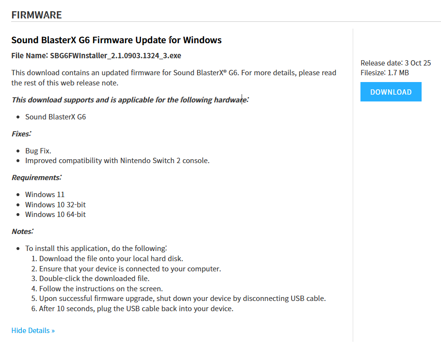 Sound BlasterX G6 펌웨어 업데이트 2025.12.15 21:49 PC.Div.Soft/Driver.Firmware 반응형 헐...이거 아직 업데이트해주네요. 10월에 등록되었는데 이제 챙겨봤습니다. 내역은 버그 수정 및 닌텐도 스위치 2 콘솔과의 호환성 증대가 업데이트 내역입니다. 종종 소리가 죽는 문제 같은 거 있었는데 잘 해결되었는지 모르겠네요. 파일 받아서 실행하고, 설명에 따른 뒤 USB 케이블 제거하고 10초 후 전원 재인가하라고 합니다. 상세 업데이트 방법은 공홈을 참조하세요. 반응형 공유하기 게시글 관리 Klein Berry 'PC.Div.Soft > Driver.Firmware' 카테고리의 다른 글 Sound Blaster GS5 펌웨어 업데이트 (0) 2025.12.15 AMD 칩셋 드라이버 업데이트 (0) 2025.12.14 Realtek PCIe 랜 드라이버 (0) 2025.12.14 댓글 공유하기 다른 글 댓글 이 글 공유하기 구독하기 구독하기 카카오톡 카카오톡 라인 라인 트위터 트위터 Facebook Facebook 카카오스토리 카카오스토리 밴드 밴드 네이버 블로그 네이버 블로그 Pocket Pocket Evernote Evernote 다른 글 Creative Pebble Nova 펌웨어 업데이트(v1.08) Creative Pebble Nova 펌웨어 업데이트(v1.08) 2025.12.15 Sound Blaster GS5 펌웨어 업데이트 Sound Blaster GS5 펌웨어 업데이트 2025.12.15 AMD 칩셋 드라이버 업데이트 AMD 칩셋 드라이버 업데이트 2025.12.14 Realtek PCIe 랜 드라이버 Realtek PCIe 랜 드라이버 2025.12.14 다른 글 더 둘러보기