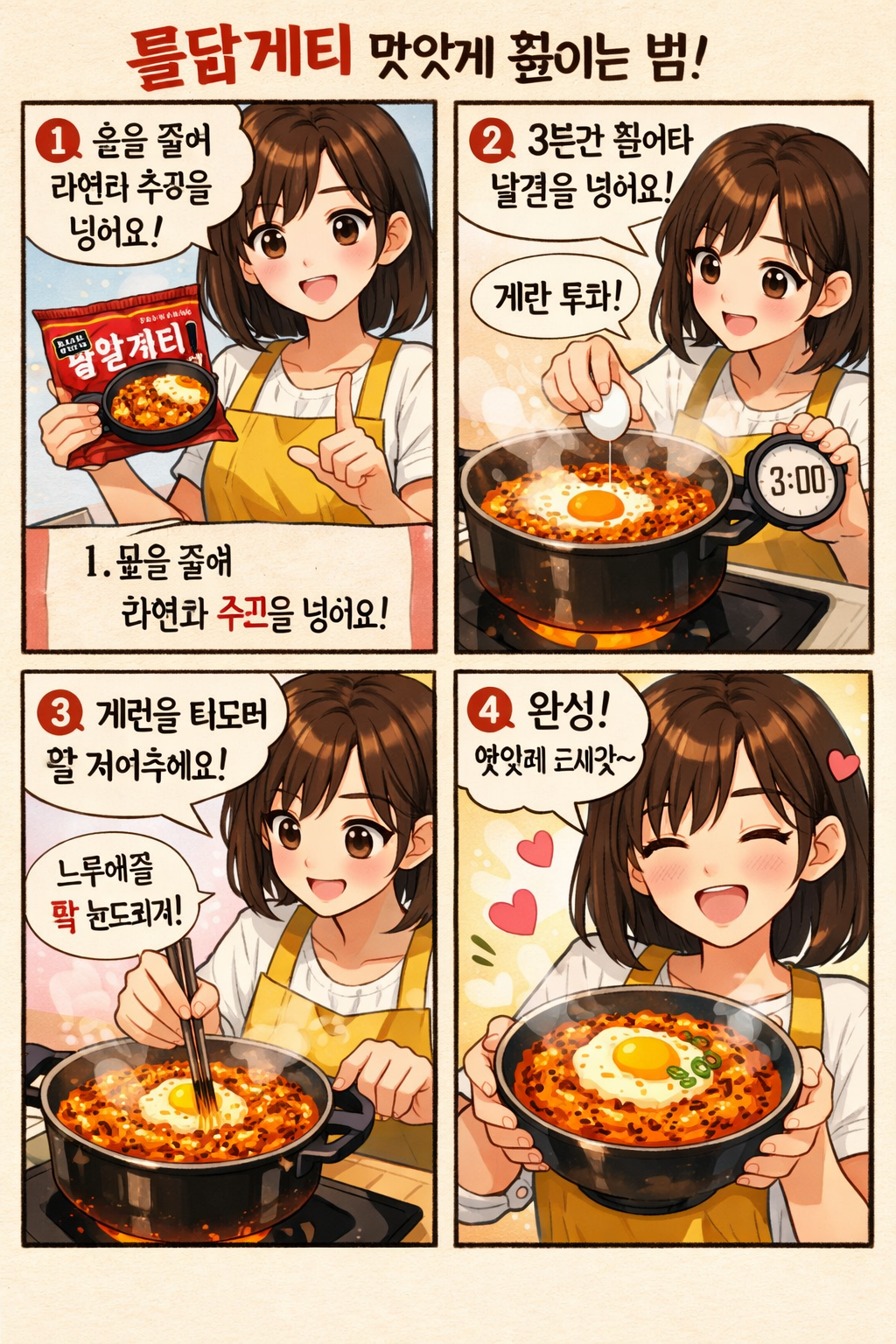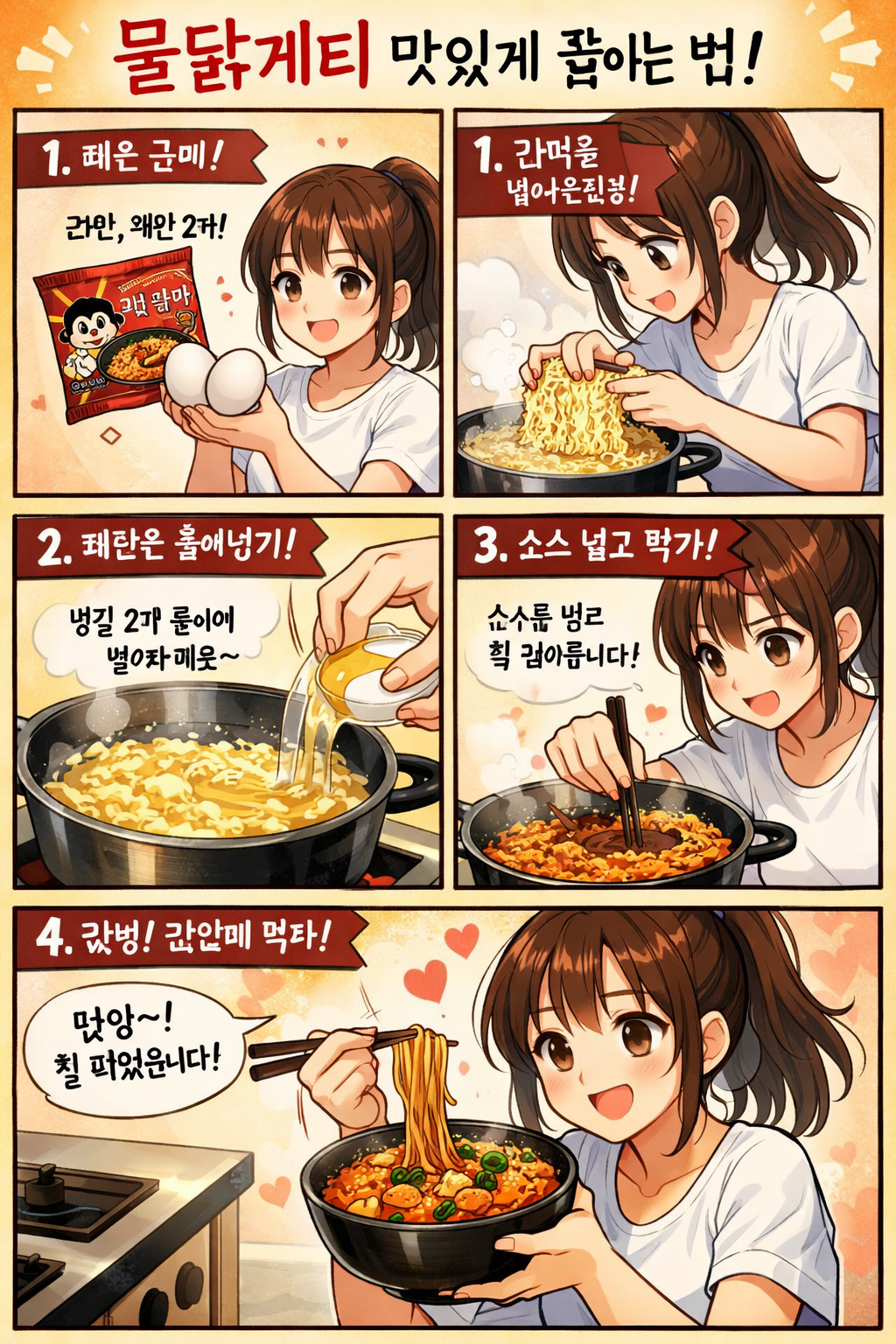 불닭게티 맛있게 끓이는 법 4컷 만화로 해달라고 했느데 아래처럼(.....) 그려주네요; 아마 불닭게티가 뭔지 몰라서 닭 = 달걀 넣은게 아닐까 싶지만요.