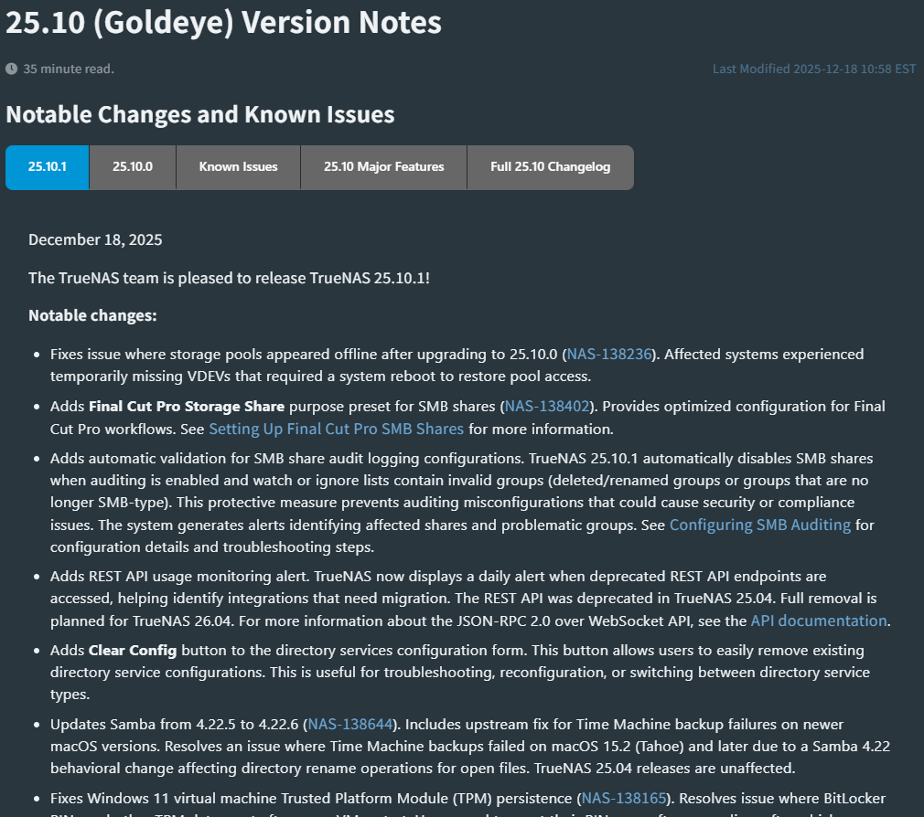 TrueNAS 25.10.1 배포 2025.12.19 03:09 ETC.Mobile/Nas.HomeLab 반응형 트루나스의 25.10.1 버전이 배포되었습니다. 스토리지 풀이 오프라인으로 나타나는(!) 문제 수정, SMB 관련 수정, Samba 업데이트, Windows 11 가상 머신 TPM 지속성 문제 수정, 풀 작업용 오류 메시지 개선 등이 이루어졌다고 하네요. 반응형 공유하기 게시글 관리 Klein Berry 'ETC.Mobile > Nas.HomeLab' 카테고리의 다른 글 ASUSTOR, ADM 5.1.1 RCI1 배포 (0) 2025.12.24 시놀리지 DSM 7.3.2-86009 출시 (0) 2025.12.02 TrueNAS Scale 25.10.0.1업데이트 (0) 2025.11.21 댓글 공유하기 다른 글 댓글 이 글 공유하기 구독하기 구독하기 카카오톡 카카오톡 라인 라인 트위터 트위터 Facebook Facebook 카카오스토리 카카오스토리 밴드 밴드 네이버 블로그 네이버 블로그 Pocket Pocket Evernote Evernote 다른 글 트루나스 카탈로그 싱크 에러 뜰 적에 트루나스 카탈로그 싱크 에러 뜰 적에 2026.02.16 ASUSTOR, ADM 5.1.1 RCI1 배포 ASUSTOR, ADM 5.1.1 RCI1 배포 2025.12.24 시놀리지 DSM 7.3.2-86009 출시 시놀리지 DSM 7.3.2-86009 출시 2025.12.02 TrueNAS Scale 25.10.0.1업데이트 TrueNAS Scale 25.10.0.1업데이트 2025.11.21 다른 글 더 둘러보기