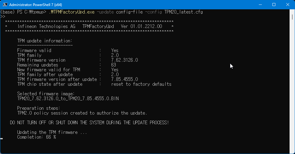.\TPMFactoryUpd.exe -update tpm20-emptyplatformauth -firmware .\TPM20_7.62.3126.0_to_TPM20_7.85.4555.0.BIN