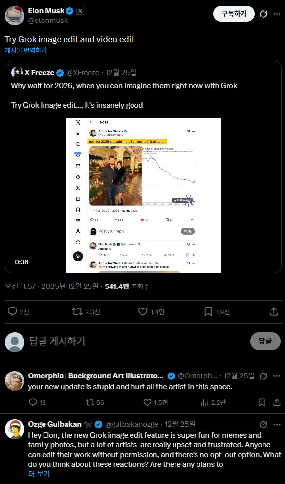 X, AI 이미지 편집 기능 추가 2025.12.26 21:03 Web.World/Ai.ML.SD 반응형 X에 Grok AI를 사용한 이미지 편집 기능이 추가되었습니다. 근데 이게 자신의 이미지 만이 아니라 타인의 이미지에도 적용할 수 있어서 많은 질타를 받고 있네요...아티스트분들의 X 탈출이 이어지고 있고요.... 반응형 공유하기 게시글 관리 Klein Berry 'Web.World > Ai.ML.SD' 카테고리의 다른 글 Apple, 사진으로 3D 공간 생성하는 ML-SHARP (0) 2025.12.26 알리바바, Qwen Image Edit 2511 공개 (0) 2025.12.24 Qwen3 TTS 공개 (0) 2025.12.23 댓글 공유하기 다른 글 댓글 이 글 공유하기 구독하기 구독하기 카카오톡 카카오톡 라인 라인 트위터 트위터 Facebook Facebook 카카오스토리 카카오스토리 밴드 밴드 네이버 블로그 네이버 블로그 Pocket Pocket Evernote Evernote 다른 글 AMD, EXPO v1.2 준비중 AMD, EXPO v1.2 준비중 2025.12.26 Apple, 사진으로 3D 공간 생성하는 ML-SHARP Apple, 사진으로 3D 공간 생성하는 ML-SHARP 2025.12.26 알리바바, Qwen Image Edit 2511 공개 알리바바, Qwen Image Edit 2511 공개 2025.12.24 Qwen3 TTS 공개 Qwen3 TTS 공개 2025.12.23 다른 글 더 둘러보기