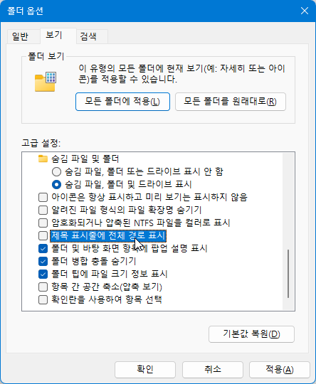윈도 제목 표시줄에 전체 경로 표시하기 2025.12.29 14:33 PC.Div.Soft/Windows.Office 반응형 이게 윈도11은 작업 표시줄의 아이콘 형태로 이쁘게 되고, 제목만 표시되는 게 기본이라(윈도10에서도 그렇지만) 보통은 크게 불편하지 않고, 탭이동 잦은 작업을 할 적엔 토탈 커맨더, Files 같은 거로 작업을 하면 편해서 신경 안쓰는데 탐색기만 써야 하는 환경이라면 종종 도움이 됨. 폴더 옵션(탐색기 메뉴에서 ... 누르면 옵션이 있음) > [보기]탭 > 제목 표시줄에 전체 경로 표시를 하면 제목 표시줄에 경로 전체를 보여준다. 반응형 공유하기 게시글 관리 Klein Berry 'PC.Div.Soft > Windows.Office' 카테고리의 다른 글 Microsoft Copilot Keyboard(베타) (0) 2025.12.29 윈도 일본어 입력에서 한자 재변환하기 (0) 2025.12.29 Windows 11 NVME SSD 드라이버 교체로 성능 향상 (0) 2025.12.26 댓글 공유하기 다른 글 댓글 이 글 공유하기 구독하기 구독하기 카카오톡 카카오톡 라인 라인 트위터 트위터 Facebook Facebook 카카오스토리 카카오스토리 밴드 밴드 네이버 블로그 네이버 블로그 Pocket Pocket Evernote Evernote 다른 글 Microsoft Copilot Keyboard(베타) Microsoft Copilot Keyboard(베타) 2025.12.29 윈도 일본어 입력에서 한자 재변환하기 윈도 일본어 입력에서 한자 재변환하기 2025.12.29 Windows 11 NVME SSD 드라이버 교체로 성능 향상 Windows 11 NVME SSD 드라이버 교체로 성능 향상 2025.12.26 Microsoft, 하드웨어 가속 BitLocker 공개 Microsoft, 하드웨어 가속 BitLocker 공개 2025.12.26 다른 글 더 둘러보기