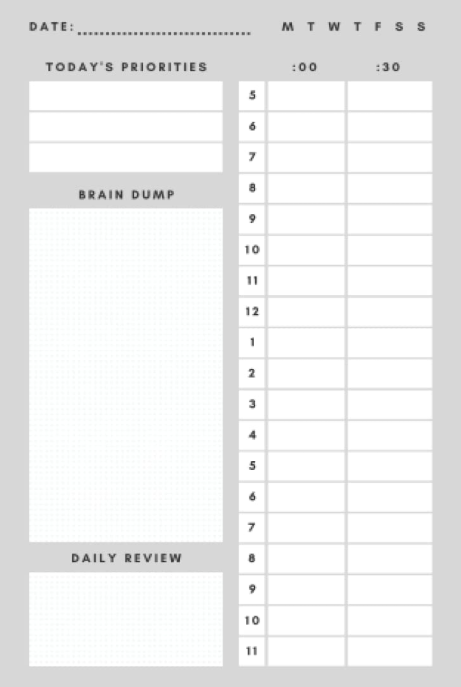 사용법은 간단. 시간을 적고, 할 일 목록 전부 쏟아적기(브레인 덤프), 최우선 순위(가장 중요한) 3가지 별도로 적고, 중요한 일 몇시~몇시 쓸지 적기(15~30분 단위, 현실적인 시간 제한), 최우선 순위3 처리 후 나머지 처리. 머스크는 5분 단위로 한다는데, 이거 5분 단위로 하기엔 좀 빡빡하지 않나 싶음. 의도적으로 빡빡한 마감 시간을 정해서 집중력을 올리는 효과인데, 그래도 5분 단위로 제어하는 건 힘들지 않나...싶다. 유튭에 자료 많은 편.