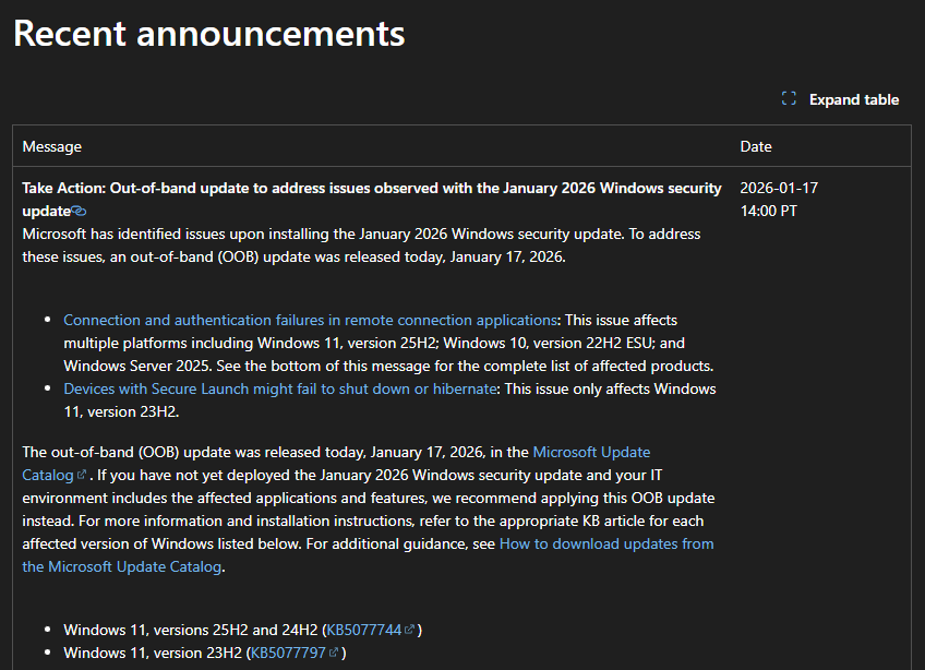 MS, Windows 1월 보안 업데이트에 따른 오류 수정 패치 배포 2026.01.19 21:43 PC.Div.Soft/Windows.Office 반응형 Microsoft가 1월 보안 업데이트로 발생하는 여러 문제를 해결하는 패치를 배포하고 있습니다. 원격 연결 앱 인증 실패, 보안 시작 기능이 활성화된 장치가 올바르게 종료되거나 절전 모드로 진입하지 못하는 문제 등을 해결하는 패치라고 하네요. 반응형 공유하기 게시글 관리 Klein Berry 'PC.Div.Soft > Windows.Office' 카테고리의 다른 글 윈도에서 WSL 제거하기 (0) 2026.02.01 OpenCL™, OpenGL®, Vulkan® 호환 팩 (0) 2026.01.16 Microsoft, 2026년 첫 Windows Update 출시 (0) 2026.01.14 댓글 공유하기 다른 글 댓글 이 글 공유하기 구독하기 구독하기 카카오톡 카카오톡 라인 라인 트위터 트위터 Facebook Facebook 카카오스토리 카카오스토리 밴드 밴드 네이버 블로그 네이버 블로그 Pocket Pocket Evernote Evernote 다른 글 윈도에서 Hyper-V 끄기 윈도에서 Hyper-V 끄기 2026.02.01 윈도에서 WSL 제거하기 윈도에서 WSL 제거하기 2026.02.01 OpenCL™, OpenGL®, Vulkan® 호환 팩 OpenCL™, OpenGL®, Vulkan® 호환 팩 2026.01.16 Microsoft, 2026년 첫 Windows Update 출시 Microsoft, 2026년 첫 Windows Update 출시 2026.01.14 다른 글 더 둘러보기