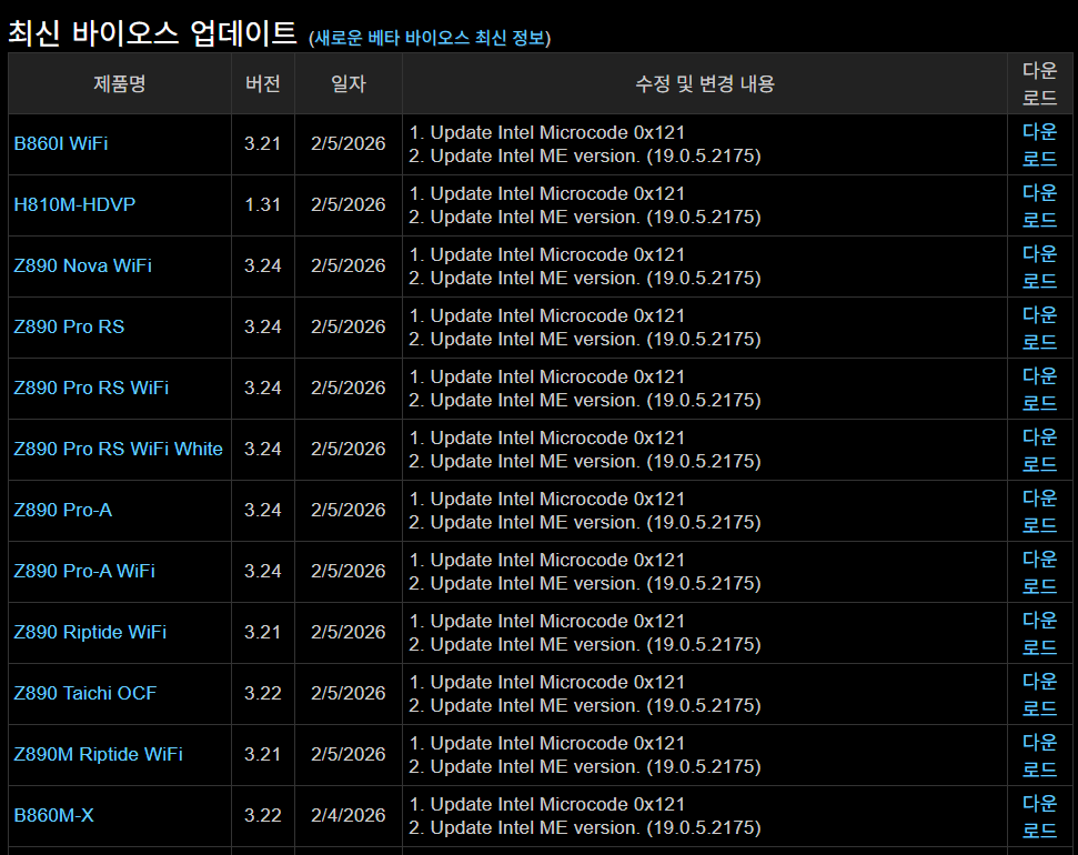 ASRock, AMD AM5 플랫폼, Intel 800 시리즈 보드 BIOS업데이트 2026.02.08 22:53 PC.Div.Soft/Driver.Firmware 반응형 ASRock에서 자사의 Intel 800시리즈 칩셋을 사용한 머더보드와 AMD AM5 플랫폼 보드의 BIOS 업데이트를 진행했습니다. AM5는 베타 버전이고요. 인텔의 경우 마이크로 코드 및 ME 업데이트, AM5의 경우 AGESA 코드 업데이트, 메모리 호환성 최적화, 일부 CPU 환경에서의 부팅 실패 문제를 해결했다고 하니 사용하시는 분들은 업데이트를 챙겨보세요. 반응형 공유하기 게시글 관리 Klein Berry 'PC.Div.Soft > Driver.Firmware' 카테고리의 다른 글 AMD 칩셋 드라이버 업데이트 (0) 2026.02.18 Marvell AQtion Windows 10 and 11 64-bit 드라이버 (0) 2026.02.01 리얼텍 유선랜 드라이버 업데이트 (0) 2026.02.01 댓글 공유하기 다른 글 댓글 이 글 공유하기 구독하기 구독하기 카카오톡 카카오톡 라인 라인 트위터 트위터 Facebook Facebook 카카오스토리 카카오스토리 밴드 밴드 네이버 블로그 네이버 블로그 Pocket Pocket Evernote Evernote 다른 글 AMD 칩셋 드라이버 업데이트 AMD 칩셋 드라이버 업데이트 2026.03.12 AMD 칩셋 드라이버 업데이트 AMD 칩셋 드라이버 업데이트 2026.02.18 Marvell AQtion Windows 10 and 11 64-bit 드라이버 Marvell AQtion Windows 10 and 11 64-bit 드라이버 2026.02.01 리얼텍 유선랜 드라이버 업데이트 리얼텍 유선랜 드라이버 업데이트 2026.02.01 다른 글 더 둘러보기