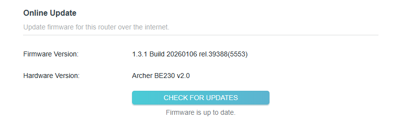 TP-LINK의 BE230 공유기의 신규 펌웨어가 등록되었습니다. 1월말부터 V1을 시작으로 진행되는데 종종 업데이트 내역이 바뀌고, 생각보다 자주 업데이트가 있어서 언제 올라오나.....하고 있는데 이번에 등록되었네요. 버전은 V2_1.1.3 Build 20251120라고하는데 웹UI에 들어가면 1.3.1 Build 20260106 rel.39388(5553)로 업데이트되고, 이 버전 아래로는 롤백이 불가능하게 됩니다.