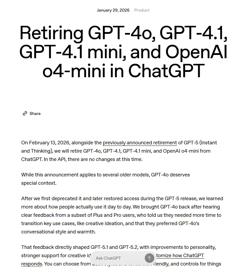 여타 LLM의 API를 사용한 곳들에서는 당분간 4o를 사용할 수 있지 않나 싶습니다만, 하나의 모델 서비스 종료하는 데에도 여러가지 생각을 하게 되네요.