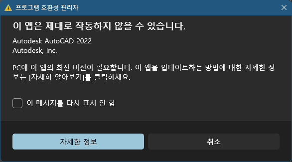 와...이거 보통은 신경 쓸 일 없는데 지인 사무실 컴 윈도10 > 윈도11로 마이그레이션 하니까 경고 뜨더라. 최신 소프트웨어 쓰라고. 오토데스크 홈페이지에서도 안내하고 있다. 동작은하는데, 올바른 기능 동작, 보안, 라이선스를 보장하지 않는다고(....). 윈도11에서 사용 가능한 오토캐드는 버전 2023부터라고 하니 참조합시다. 이거 몰랐는데 AutoCAD 2022가 설치되어 있는 시스템의 경우 Windows 11 24H2로의 업그레이드가 차단된다고 한다. 2022.1.4 업데이트후로 해결되었다고...
