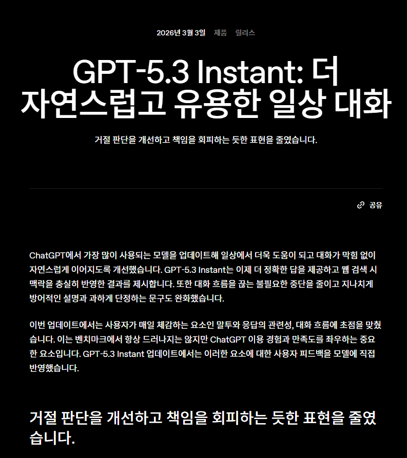 ChatGPT에 GTP 5.3 Instant가 적용되었습니다. 아침에 보니 적용되어 있어서 확인해보니 관련 내용이 있네요. 일상 대화에 초점을 맞춘 튜닝이라고 합니다. 좀 더 정확한 답을 제공하고, 웹 검색 시의 맥락을 좀 더 잘 반영한다고 합니다. 그리고 지나치게 단정하는 문구, 지나치게 방어적인 설명을 완화했....다고 하는데 완화지 안하는게 아니에요.