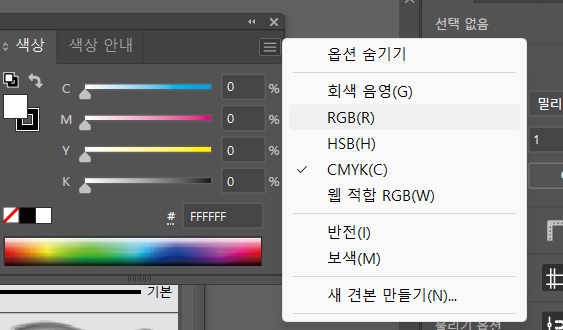 이게 왜 그런지 모르겠는데, 스포이트 툴 옵션(스포이드 툴 더블 클릭)에서 설정을 변경한 게 아니라면 색상(F6키) 패널을 열고 더보기(햄버거 메뉴)를 눌러서 이게 CMYK나 자기가 작업하는 색상 모드로 설정되어 있는지 확인해 봅시다.