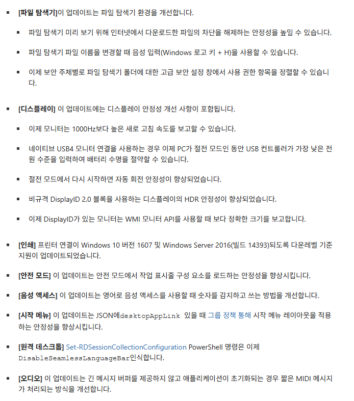 Windows 11 업데이트 미리 보기 - KB5079391 2026.03.27 21:30 PC.Div.Soft/Windows.Office 반응형 Windows 11 25H2, 24H2용 품질 개선 업데이트 미리보기가 공개되었습니다. 이번 업데이트에서 내레이터 개선(코파일럿 관련 업데이트), 스마트 앱 컨트롤 설정 개선(재설치 없이도 켜고 끌 수 있게), 파일 탐색기 관련 기능 추가(웹에서 다운로드한 파일의 미리보기 차단 등), 1,000Hz 이상의 주사율을 가진 모니터 지원, USB4 관련 절전 기능 향상 등이 이루어졌다고 하네요. 반응형 공유하기 게시글 관리 Klein Berry 'PC.Div.Soft > Windows.Office' 카테고리의 다른 글 윈도 11, 저장소 저장 공간 센스 활용하기 (0) 2026.03.20 윈도의 설정 - 제어판 전원 관리 옵션 미일치 문제 (0) 2026.03.20 윈도 11 작업 표시줄 설정하기 (0) 2026.03.15 댓글 공유하기 다른 글 댓글 이 글 공유하기 구독하기 구독하기 카카오톡 카카오톡 라인 라인 트위터 트위터 Facebook Facebook 카카오스토리 카카오스토리 밴드 밴드 네이버 블로그 네이버 블로그 Pocket Pocket Evernote Evernote 다른 글 윈도 11, 저장소 저장 공간 센스 활용하기 윈도 11, 저장소 저장 공간 센스 활용하기 2026.03.20 윈도의 설정 - 제어판 전원 관리 옵션 미일치 문제 윈도의 설정 - 제어판 전원 관리 옵션 미일치 문제 2026.03.20 윈도 11 작업 표시줄 설정하기 윈도 11 작업 표시줄 설정하기 2026.03.15 104/106 키 오른쪽 Ctrl, Alt 키 변경 레지스트리 104/106 키 오른쪽 Ctrl, Alt 키 변경 레지스트리 2026.02.27 다른 글 더 둘러보기